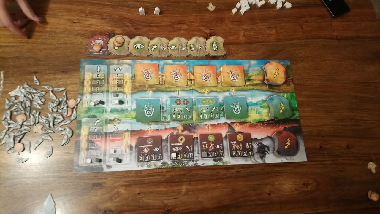 Leider endet damit auch schon die Interaktivität. Denn die Ereignisse oder 4 möglichen Aktionen, die in der 2. Phase abgehandelt werden, Nachwuchs (neue Stammesmitglieder auf Felder mit alten stellen), Bewegen (Stammesmitglieder auf benachbarte Felder bewegen), Erkunden (neue Felder ziehen und an seine Landschaft anlegen) und Errungenschaften machen (neues Wissen aufdecken, erlangen und dadurch einen Wert steigern) spielen sich fast unabhängig von den anderen Spielern.
