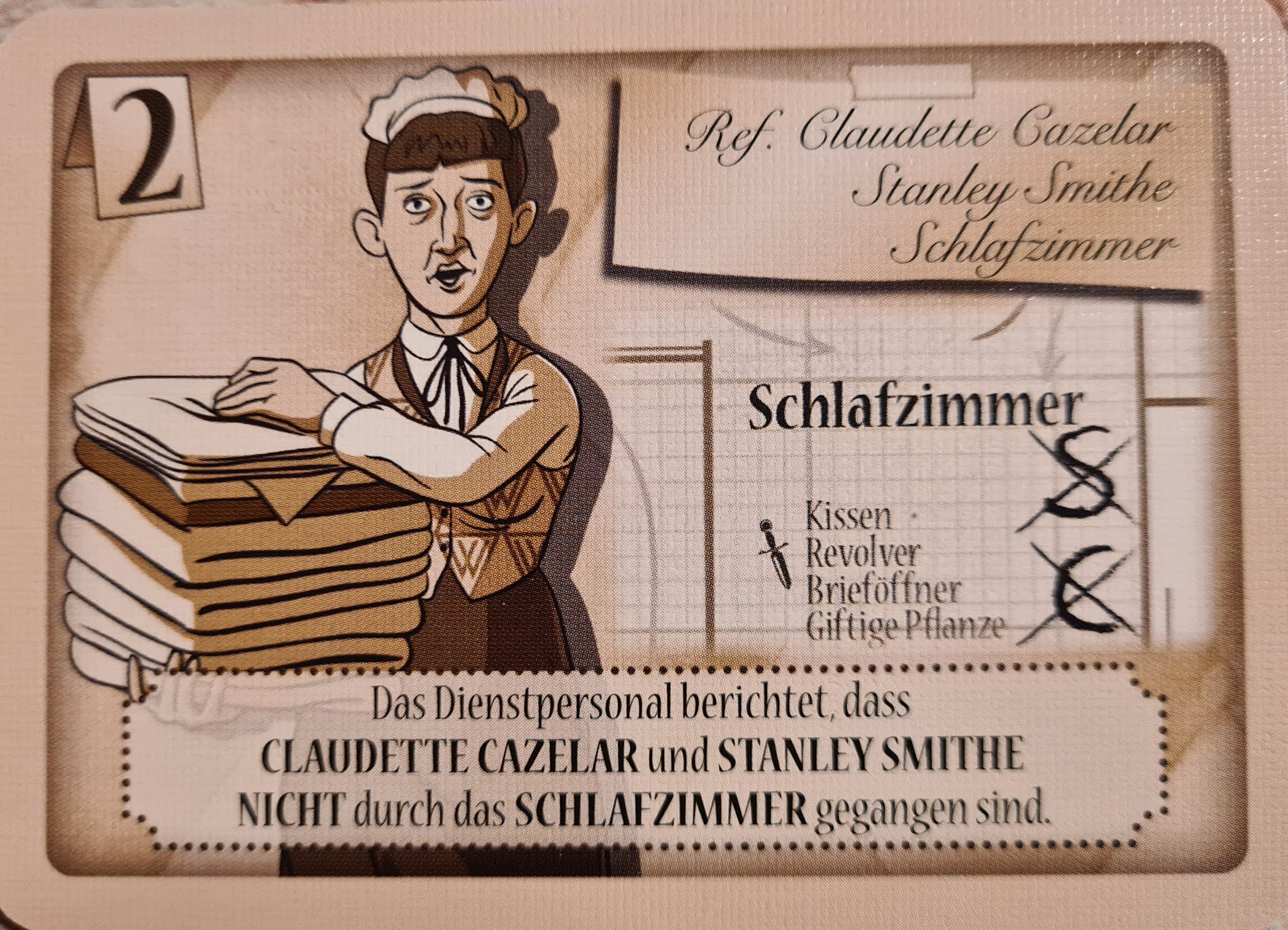 So. Wie ich das ganze finde, habe ich ja eingangs schon erwähnt: Während mich Cluedo durchaus langweilt und Inkognito immer die richtige Gruppe braucht und meiner Meinung nach nur zu viert so wirklich funktioniert, ist Unangenehme Gäste ein richtig geniales Deduktionsspiel. Hier wird eben nicht gesagt „wer hat ein Messer? – Keiner? – Ah!“ sondern „wer hat Infos zur Küche? – Aha, Claudette war nicht hier – Die Waffe muss aber die Bratpfanne gewesen sein, also war sie es nicht – aber das Hausmädchen hat entweder Claudette oder Greg hier gesehen – Also muss Greg hier gewesen sein – aber bei ihm sind alle Motive weg – also weiß ich jetzt immer noch nicht, wer es war“ oder „Stanley hat zwar ein Motiv, kam aber nie in der Garage vorbei, wo die Mordwaffe lag, also war er es nicht – aber die Berwick Schwestern waren hier und hätten sogar vermutlich ein Motiv – ich muss mal Infos zu den Schwestern anfordern“.