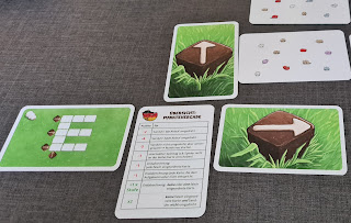 Wir decken die Aufgabe der Stufe 1 auf, drehen die Sanduhr um, legen alle Karten des entsprechenden Wombat-Stapels offen aus und versuchen die Aufgabe zu lösen. Die Aufgabe zeigt ein Muster, das wir mit Wombat-Karten nachbauen sollen, wobei die Anzahl der Wombats je Karte entlang der Pfeile unseres Rasters (in der Regel von unten nach oben und von links nach rechts) größer werden muss. Um dieses Muster zu füllen, sind wir reihum dran und wenn ich am Zug bin darf ich entweder eine neue Karte ins Feld legen oder eine Karte aus dem Feld entfernen oder zwei gelegte Karten tauschen. Man darf jederzeit miteinander sprechen. Hält man sich nicht an die Regeln, muss man sich einen Minuspunkt „nehmen“ und läuft die Zeit ab, darf man die Sanduhr pro Aufgabe maximal zwei Mal umdrehen, wobei es hier auch jeweils 2 Minuspunkte gibt. Ist die Sanduhr abgelaufen, wenn man grade drehen wollte, gibt es sogar 4 Minuspunkte und wenn man die Uhr ganz vergessen hat, muss man abbrechen und bekommt 3 Minuspunkte und muss die Aufgabe austauschen. Diese ganzen Minuspunkte sind – zugegebener Maßen – grade zu Beginn des Spiels recht heftig, wie wir gleich sehen werden.